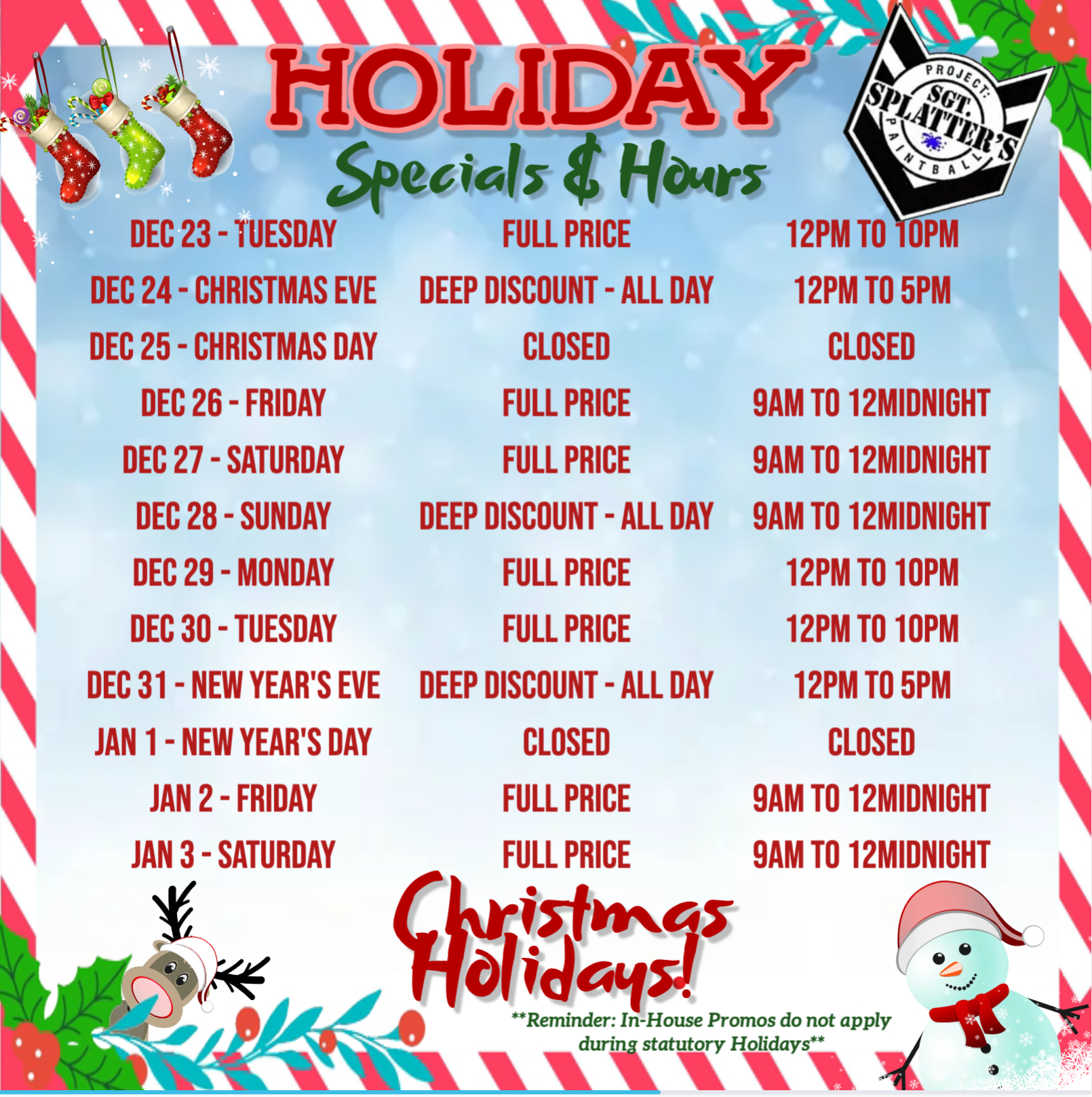 SGT Splatters Paintball will be CLOSED Christmas Day, Sunday, December 25th. Come play at Toronto's Largest Indoor Paintball Field, with over 35,000 ft at this location. There is plenty of room to host your next big company event, birthday party, bachelor party or just a gathering of friends.